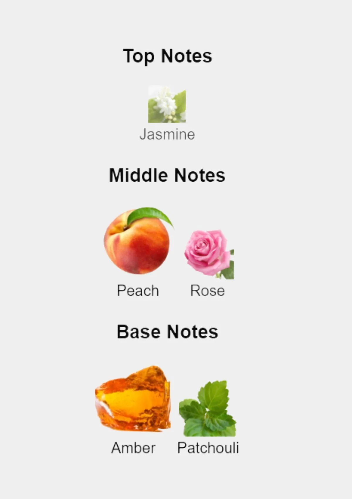The fragrance opens with sparkling top notes of jasmine flower, offering a fresh, luminous, and invigorating introduction that awakens the senses. Its heart unfolds with a rich bouquet of candied rose and peach nectar, creating a sweet, feminine, and alluring floral composition. These notes harmonize beautifully with the base of amber and patchouli, delivering a warm, sensual, and enduring finish that lingers gracefully throughout the day or evening.