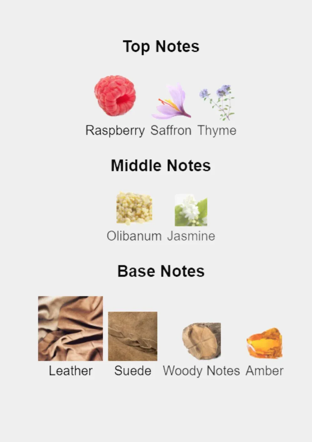 The journey begins with an iconic and daring opening. Top notes of Raspberry, Saffron, and Thyme create a unique juxtaposition. The sweetness of the raspberry provides a vibrant, fruity counterpoint to the dry, spicy heat of saffron and the herbal edge of thyme. This initial burst is both intriguing and inviting, setting a luxurious tone that immediately separates Tuscan Leather from standard fragrances.