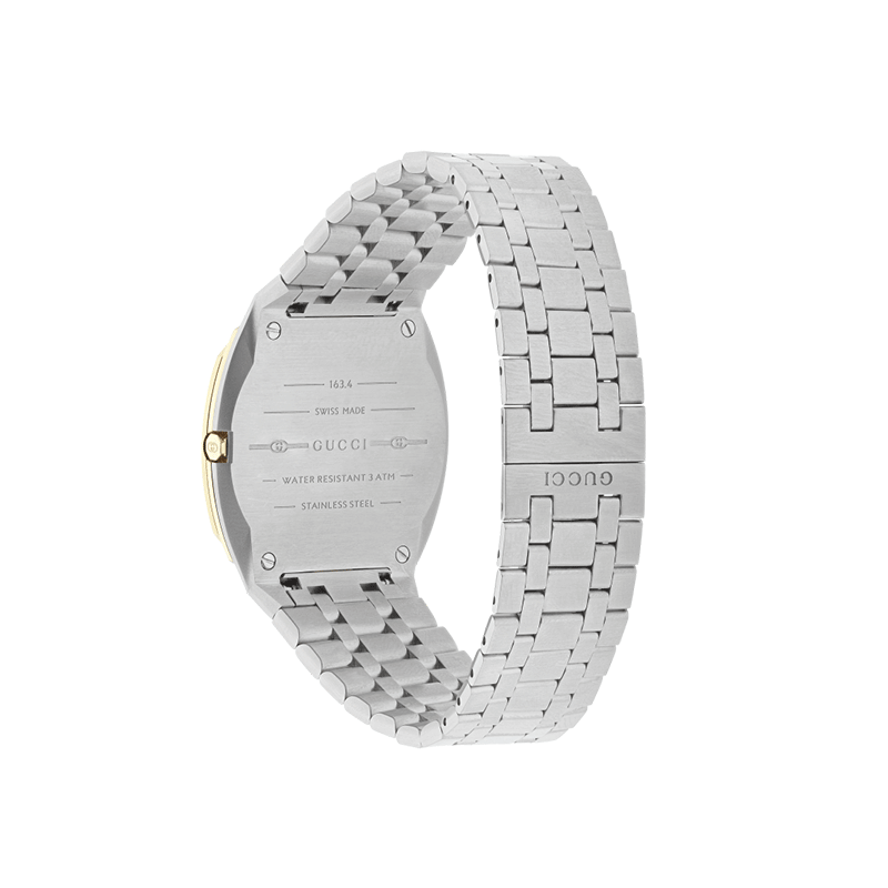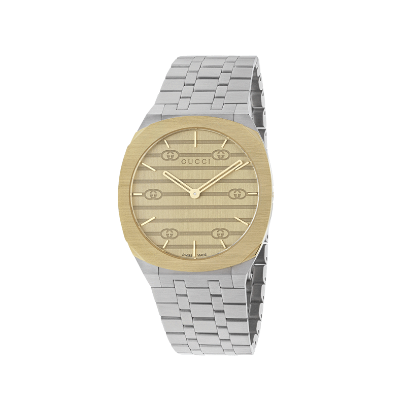 A masterpiece of modern horology, the Gucci 25H features an ultra-slim 38mm case in stainless steel and 18kt yellow gold plating. With its hidden crown and architectural lines, it offers a seamless “second skin” fit for any wrist.