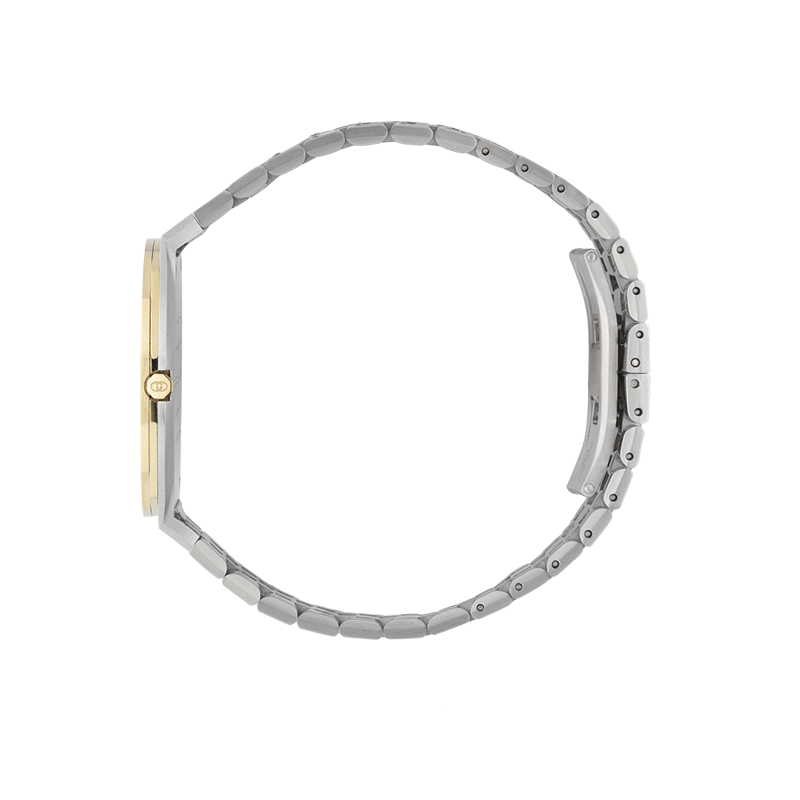 The aesthetic is defined by its clean, urban lines. By integrating a hidden crown, Gucci has achieved a perfectly symmetrical and uninterrupted circular shape, emphasizing the watch’s streamlined profile. The mixed-metal palette elevates the piece, pairing the durability of brushed stainless steel with the rich warmth of 18kt yellow gold plating on the bezel and the dial. This golden sunray dial serves as a luminous backdrop for the minimalist hour markers and the subtle interlocking G branding, reflecting Gucci’s heritage in a modern context.