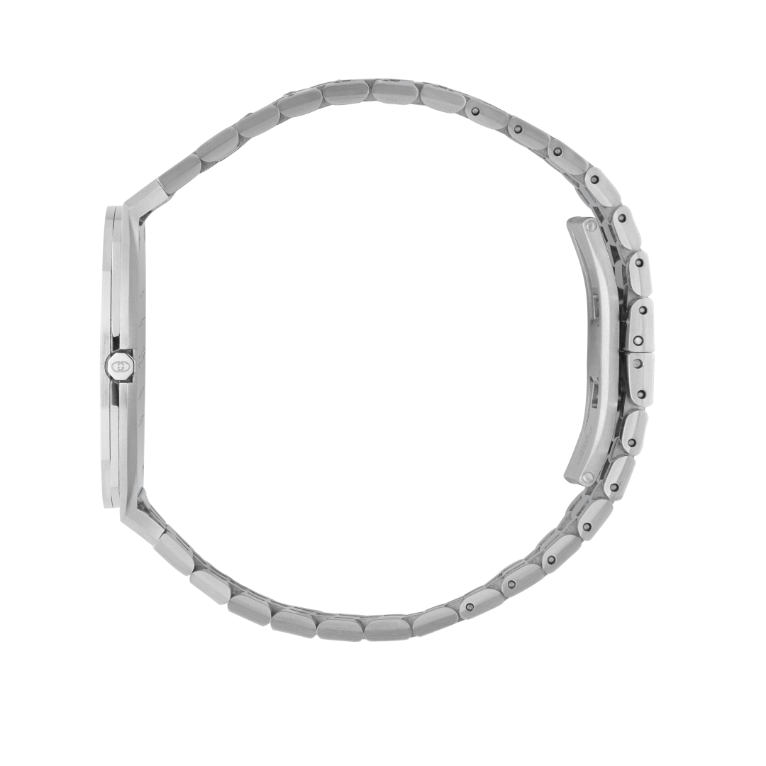 Taking inspiration from the sharp lines and geometric silhouettes of contemporary architecture, the Gucci 25H is a study in minimalism. A standout feature is the hidden crown, which is integrated seamlessly into the 38mm case. This design choice maintains a perfectly circular, uninterrupted flow, emphasizing the watch’s sleek, urban aesthetic. The grey stainless steel bracelet flows effortlessly from the case, creating a unified look that reflects the brand’s iconic status in a subtle, refined manner.