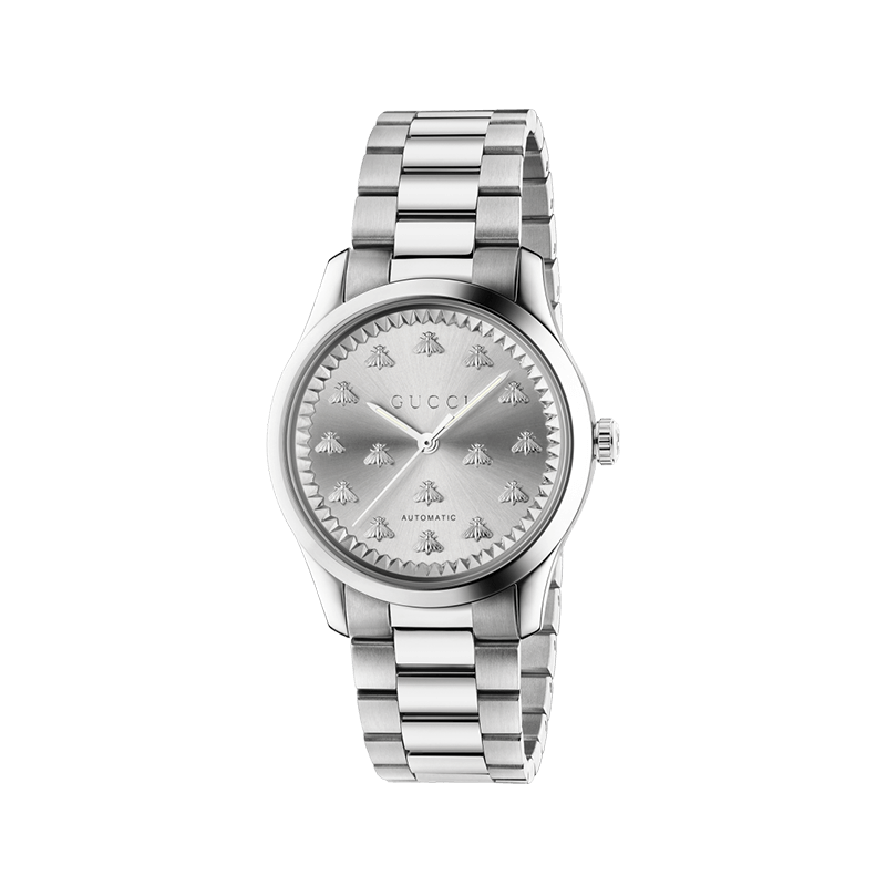 ال Gucci G-Timeless MultiBee (YA1264190) is a masterpiece of understated luxury. This 38mm automatic timepiece features a sleek silver sun-brushed dial adorned with the House’s iconic bee motifs, encased in polished stainless steel for a timeless, monochromatic aesthetic.