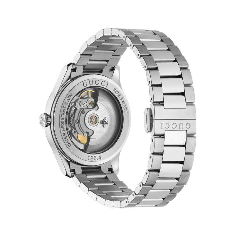 The centerpiece of this model is the stunning silver sun-brushed dial. The sun-brushed finish allows the light to dance across the surface, creating a dynamic depth that highlights the “MultiBee” motif. These bees, a signature symbol of Gucci since the 1970s, are meticulously crafted and placed across the dial, serving as both artistic flourishes and functional hour markers. Protecting this intricate display is a premium sapphire glass crystal, featuring an anti-reflective coating that ensures the shimmering silver dial remains perfectly legible under the glare of office lights or the bright afternoon sun.