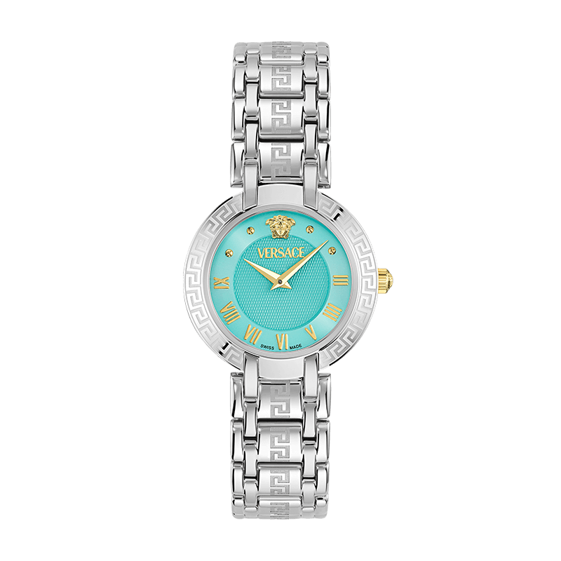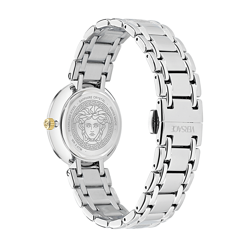 Roman numerals paired with minimalist dot indexes provide a modern reinterpretation of traditional watch design, offering readability and elegance in perfect harmony. The precise timekeeping is powered by a high-quality Swiss movement, ensuring reliability and performance that matches the watch’s exquisite design. Every element—from the finely polished case to the intricately detailed bracelet—reflects Versace’s dedication to craftsmanship, innovation, and enduring luxury.