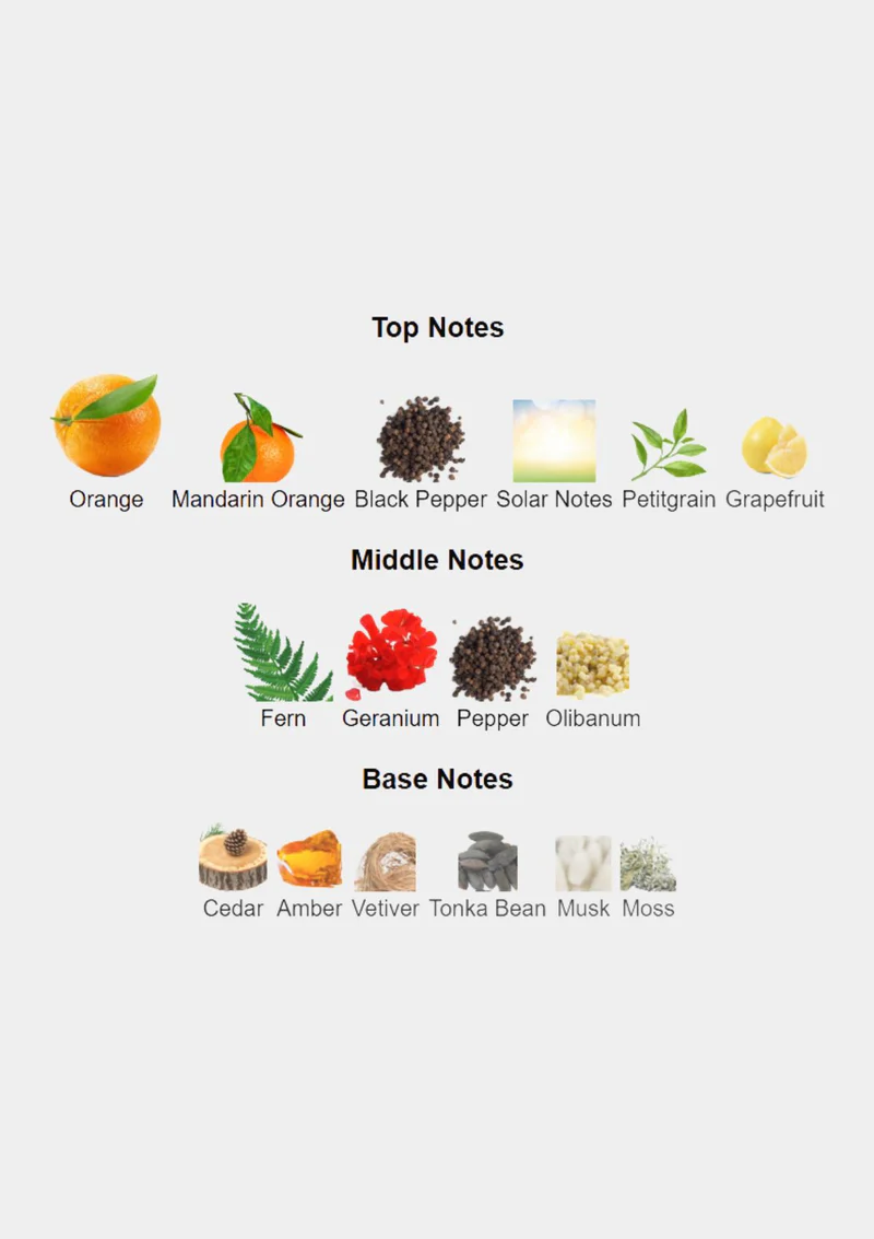 يفتتح العطر بنفحة منعشة وحيوية من عبير الشمس والحمضيات، ليخلق على الفور جواً من الإثارة والحيوية. يندمج هذا الانطلاق المشرق بسلاسة مع قلب غني بالتوابل العطرية والفلفل، ليمنح العطر سحراً آسراً يجذب انتباه من حولك. ومع تطور العطر، يستقر على قاعدة عميقة وفاخرة من خشب الأرز والعنبر ونجيل الهند الترابي. يضمن هذا المزيج ثباتاً يدوم طويلاً، يجمع بين الرصانة والقوة.