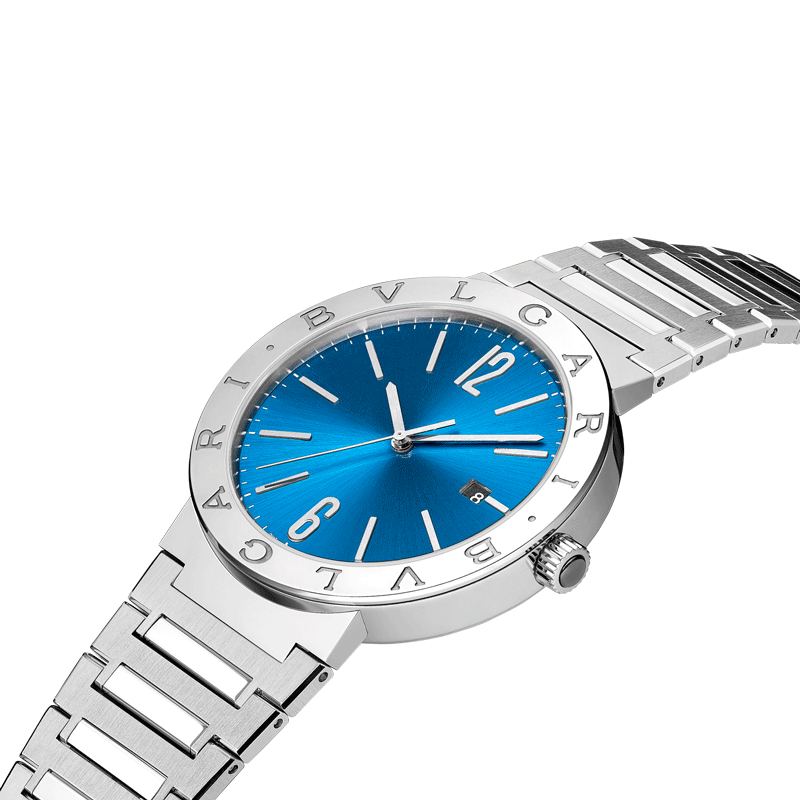 أبرز ما يميز هذه الساعة هو إطارها المحفور عليه شعار "بولغاري بولغاري" المزدوج الشهير. استُلهم هذا التصميم من النقوش الموجودة على العملات الرومانية القديمة، ليُحوّل اسم العلامة التجارية إلى نقشٍ زخرفي، في خطوةٍ تُعدّ من أكثر الأمثلة جرأةً ونجاحًا في مجال العلامات التجارية الفاخرة عبر التاريخ. يتناغم ميناء الساعة ذو اللون الأزرق الداكن المُشعّ بشكلٍ رائع مع درجات اللون الفضي للفولاذ. يُضفي هذا اللون الغني خلفيةً ديناميكيةً للمؤشرات والعقارب الفضية اللون المصقولة يدويًا، مما يضمن وضوحًا ممتازًا ولمسة من الأناقة البحرية.
