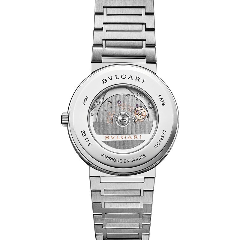 تتميز هذه الساعة بحركة ميكانيكية عالية الأداء ذاتية التعبئة، مما يوفر تجربة استخدام سلسة ومريحة. يمكن رؤية الحركة من خلال الغطاء الخلفي المصنوع من الكريستال الياقوتي، والذي يُبرز اللمسات النهائية الدقيقة التي تشتهر بها بولغاري. تُثبّت الساعة بسوار من الفولاذ المقاوم للصدأ مصنوع بدقة متناهية، مزود بإبزيم قابل للطي يضمن ملاءمة مثالية ومريحة.
