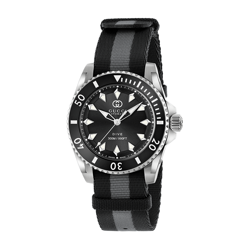 Gucci Dive Automatic Watch – 40mm Black Dial & Grey-Black Nato Strap