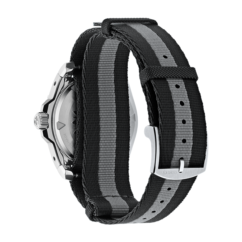 Performance is the cornerstone of the Gucci Dive series. With an impressive water resistance of 300 meters (30 ATM), this watch is capable of handling serious aquatic activities while maintaining its refined appearance. The grey and black nylon Nato strap further enhances the aesthetic. This choice of material not only provides a lightweight and comfortable fit for all-day use but also reinforces the watch’s “tool-watch” heritage, offering a textured, matte contrast to the polished steel elements of the case.