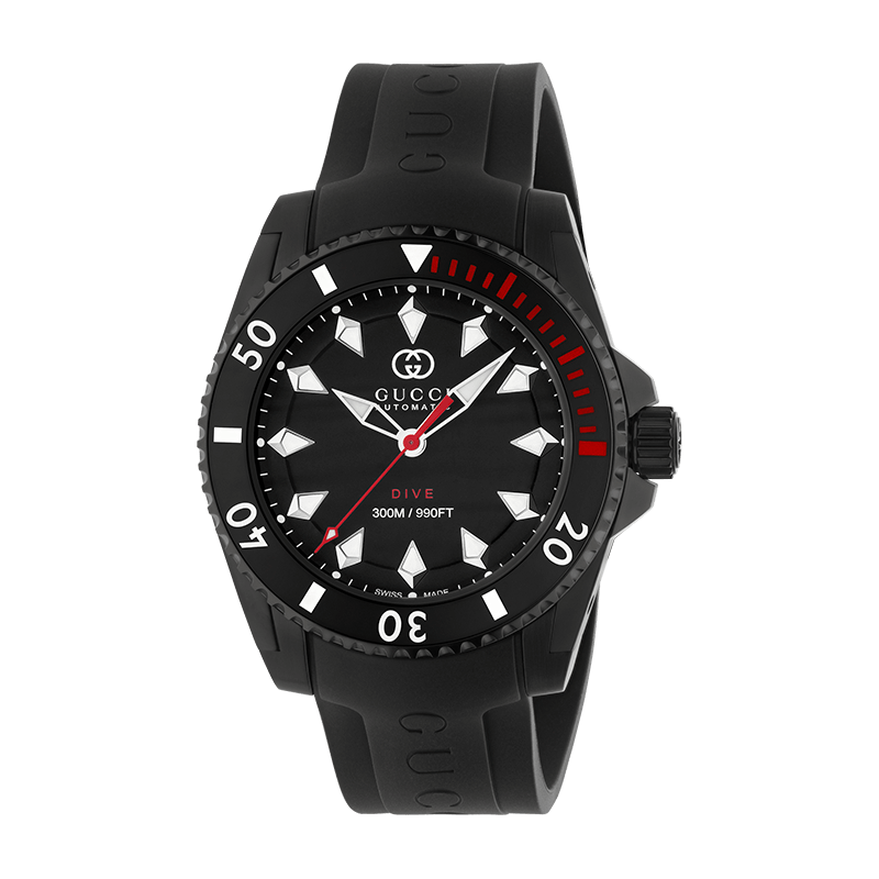 ال Gucci Dive (YA136361) combines professional-grade utility with iconic Italian luxury. This 40mm automatic timepiece features a striking black dial adorned with the Interlocking G logo, a durable black rubber strap, and an impressive 300-meter water resistance, making it the ultimate accessory for the modern explorer.
