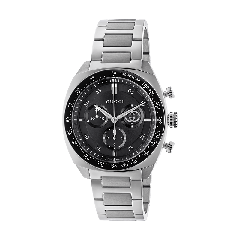 جريء وتقني، ساعة غوتشي كرونوغراف متشابكة تتميز الساعة بعلبة من الفولاذ المقاوم للصدأ بقطر 41 مم، وإطار أنيق من السيراميك الأسود مزود بمقياس سرعة الدوران، وحركة كوارتز. وتزدان الساعة بعرض ثوانٍ صغير على شكل شعار حرف G المتشابك الشهير.