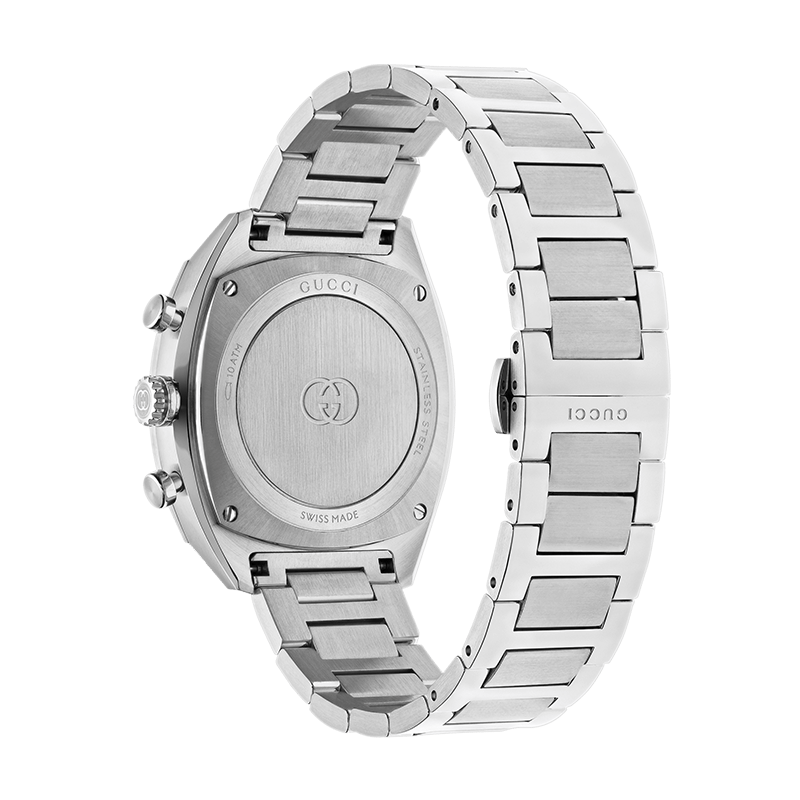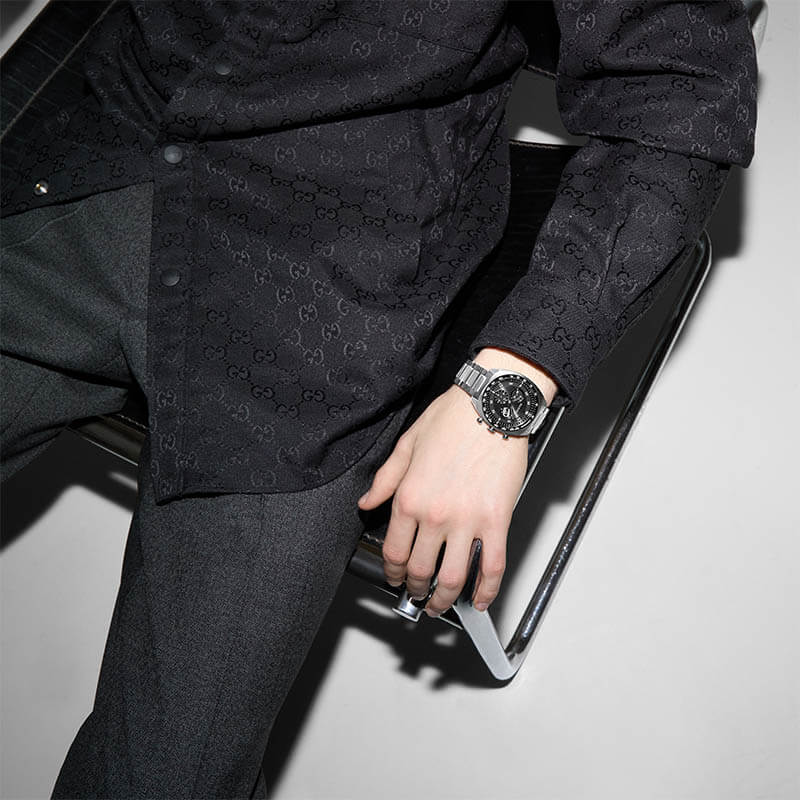 At the heart of the timepiece lies a deep black dial that serves as a high-contrast canvas for its various functions. Powered by a reliable Swiss quartz movement, the chronograph provides accurate timing, while the layout remains clean and legible. The most striking detail is found in the sub-dial: a small seconds display cleverly shaped into the signature interlocking G logo. This subtle yet powerful nod to Gucci’s heritage seamlessly integrates brand identity into the mechanical architecture of the watch, celebrating decades of iconicity without overwhelming the wearer.