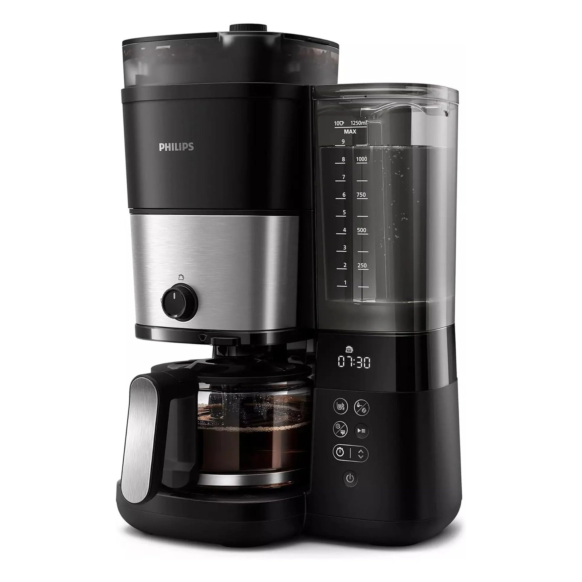 آلة متعددة الاستخدامات لتحضير القهوة من الحبوب إلى الكوب، تتميز بمطحنة مدمجة، وحاوية مزدوجة للحبوب، ومرونة تحضير إبريق زجاجي كامل سعة 1.25 لتر أو مباشرة في كوب السفر المفضل لديك.