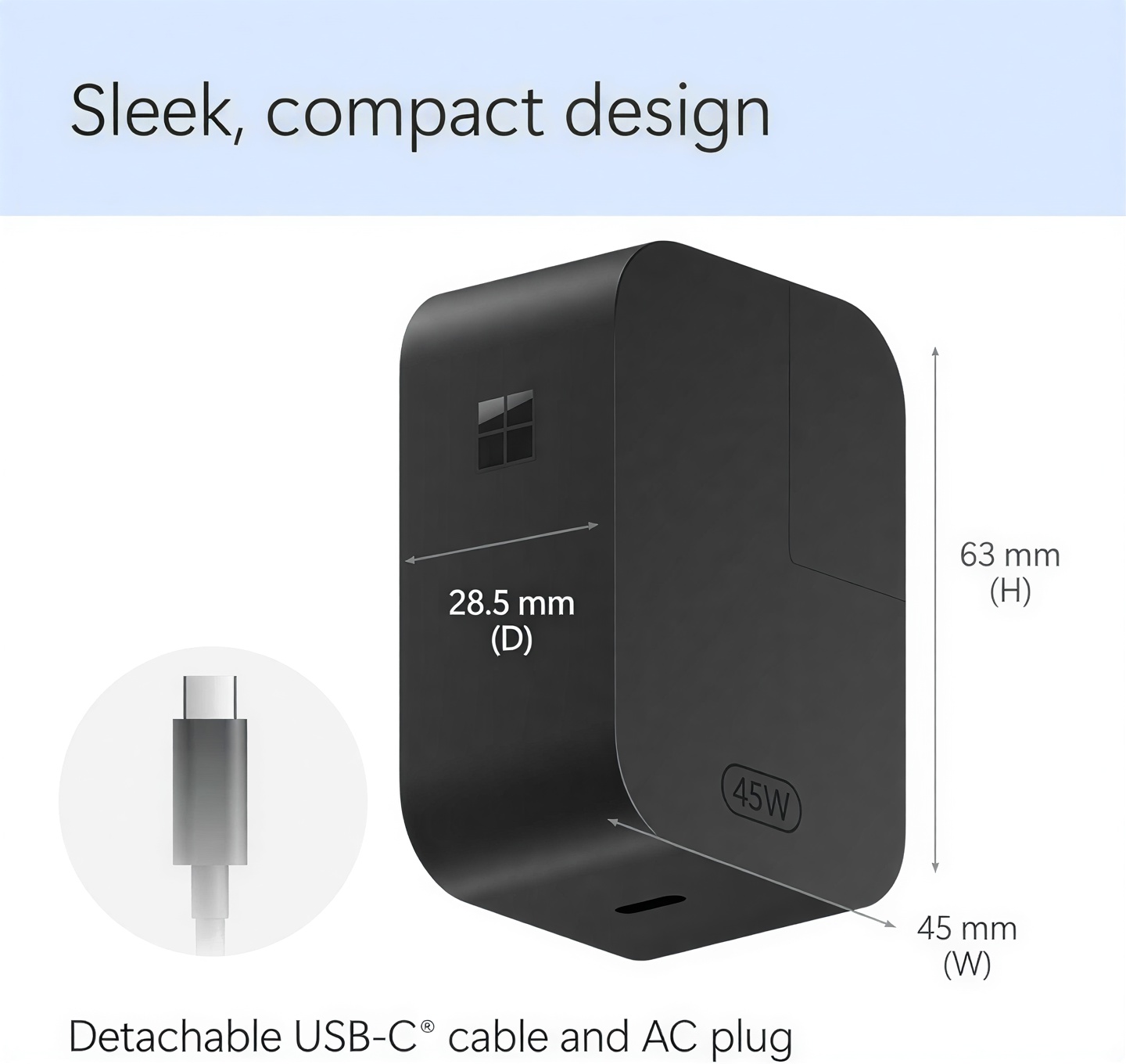 Experience reliable, high-speed charging with the Microsoft Surface 45W USB-C Power Supply. Featuring a magnetic Surface Connect tip and Power Delivery (PD) technology, this compact black adapter is the perfect travel-friendly replacement for bulky original chargers.