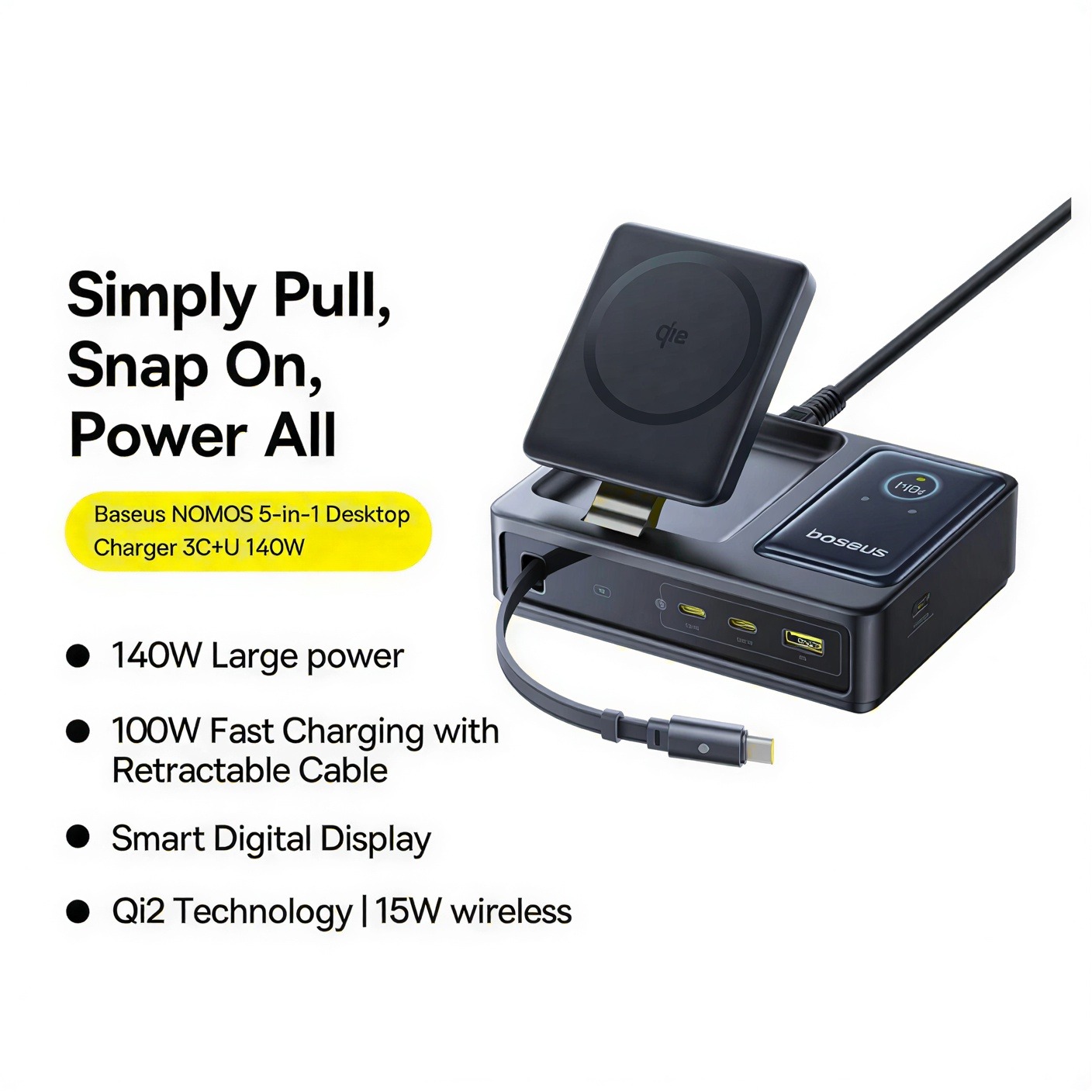 The minimalist black finish offers a professional aesthetic that blends into any environment. With universal voltage support, it is ready for international use, serving as a global power solution. The Baseus Nomos 5-in-1 Desktop Charger is more than just a utility—it is a sophisticated piece of technology that brings order, speed, and safety to your digital ecosystem, ensuring you are always ready to perform at your best.