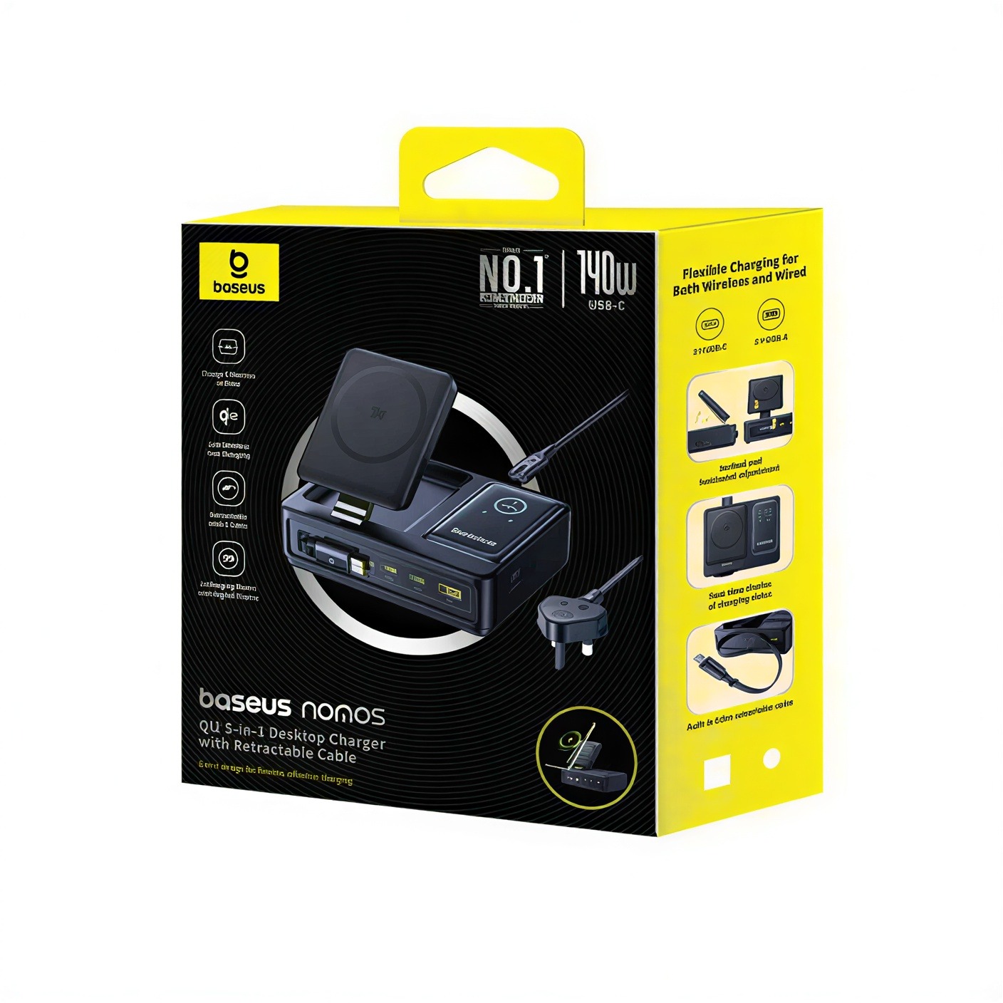 Revolutionize your workspace with the Baseus Nomos 5-in-1 Desktop Charger. Delivering a massive 140W total output, this all-in-one station supports PD 3.1 and QC protocols to fast-charge laptops, tablets, and smartphones simultaneously. Its sleek, black, compact housing minimizes clutter while providing maximum power efficiency and advanced safety for all your essential devices.