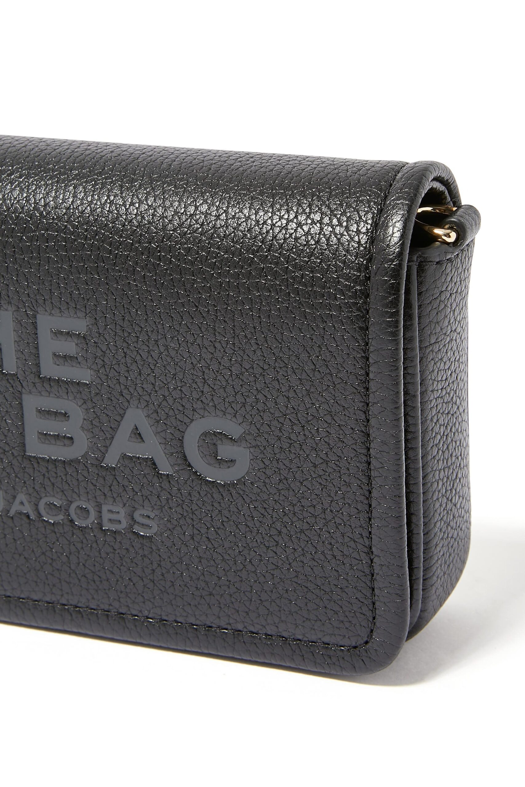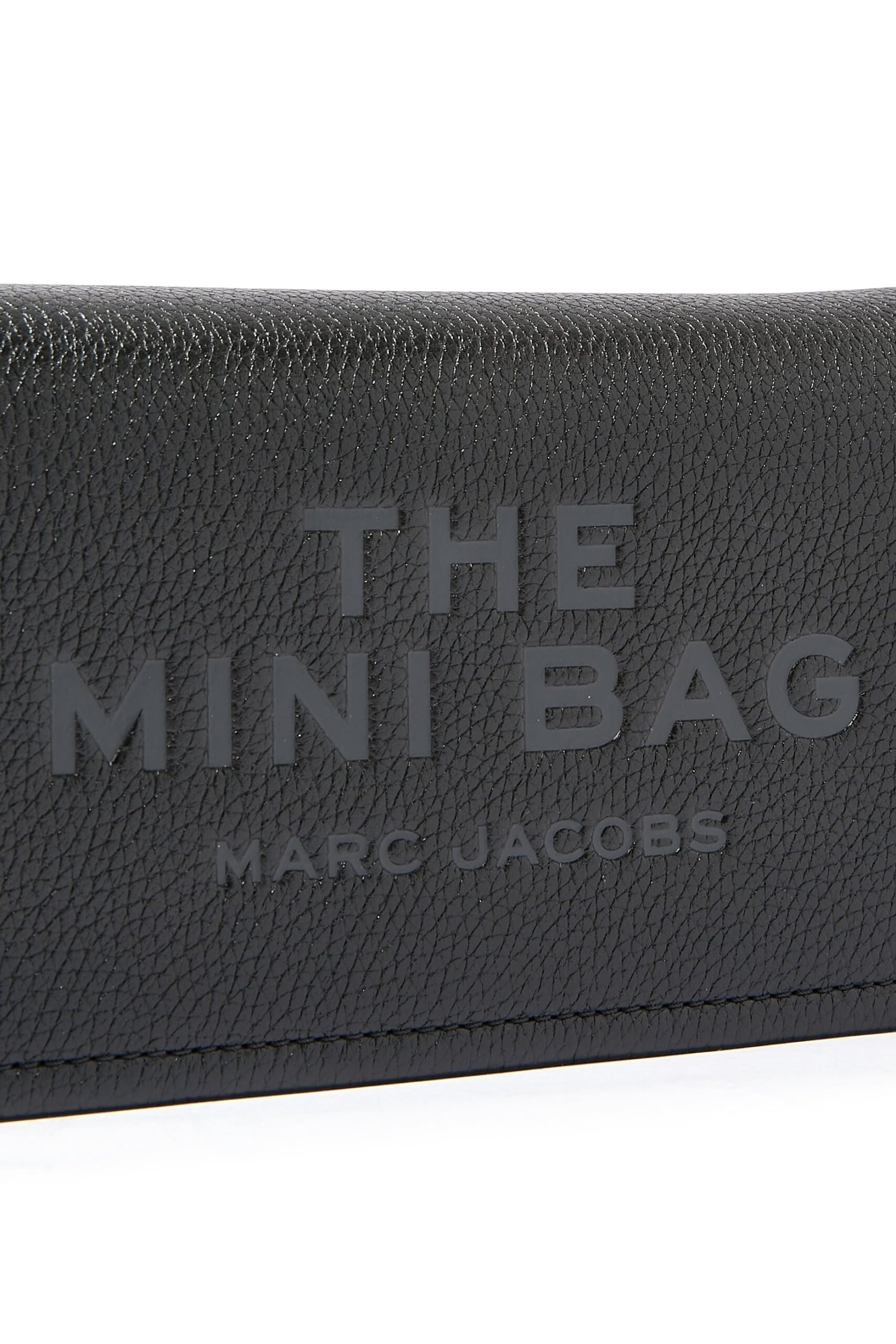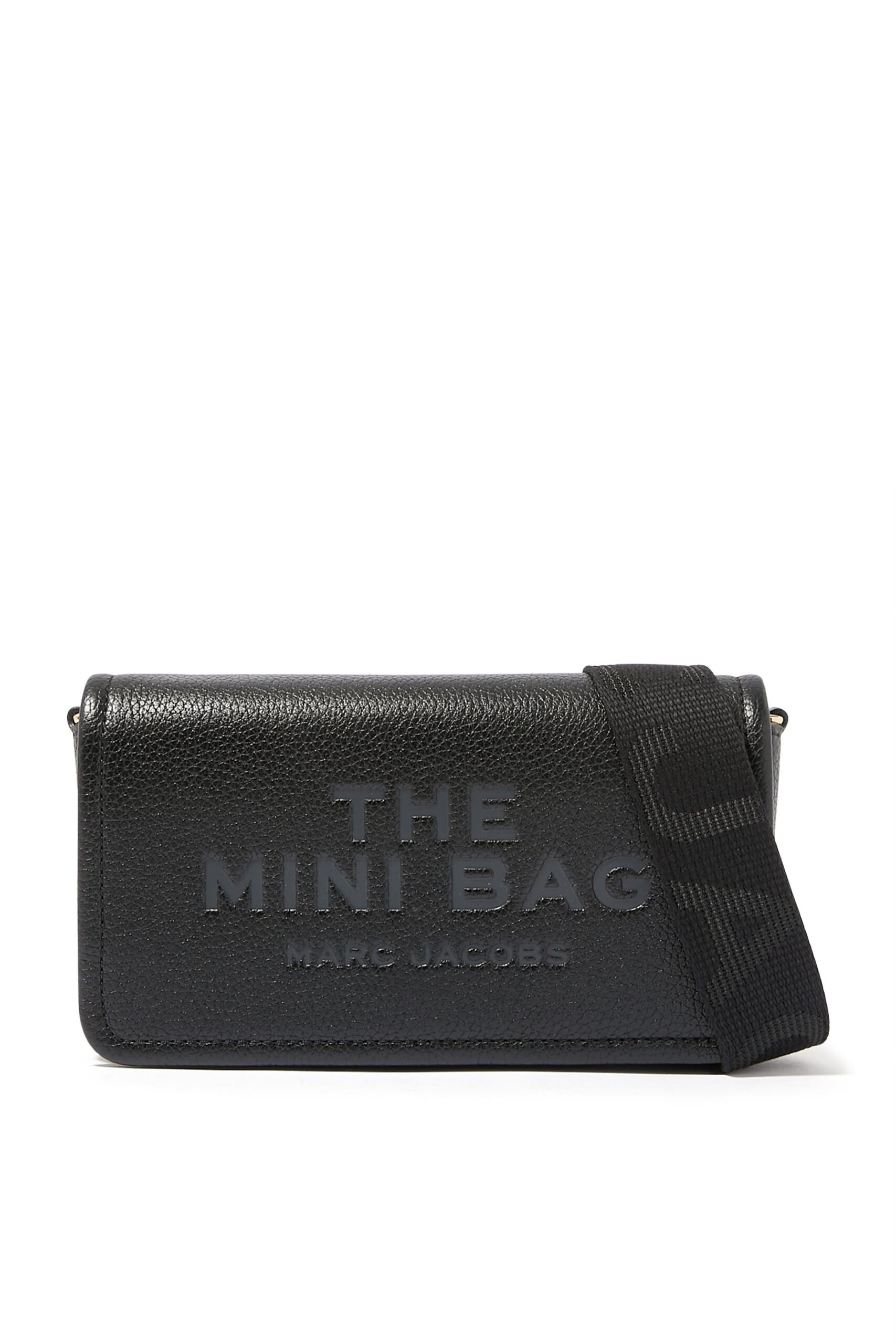 Compact Marc Jacobs Leather Mini Bag in Black featuring premium leather, adjustable strap, card slots, and signature logo design.