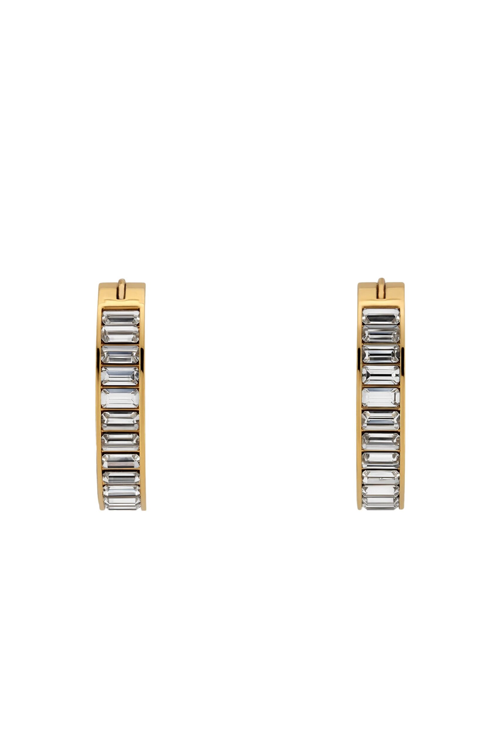 Every pair is meticulously constructed using high-quality, hypoallergenic metals that adhere to the most stringent current international regulations. The base features a sophisticated light gold-toned finish, providing a warm, lustrous glow that serves as the perfect canvas for the row of precision-set, shimmering crystals. These crystals catch the light from every angle, transforming a classic hoop silhouette into a radiant statement of style.