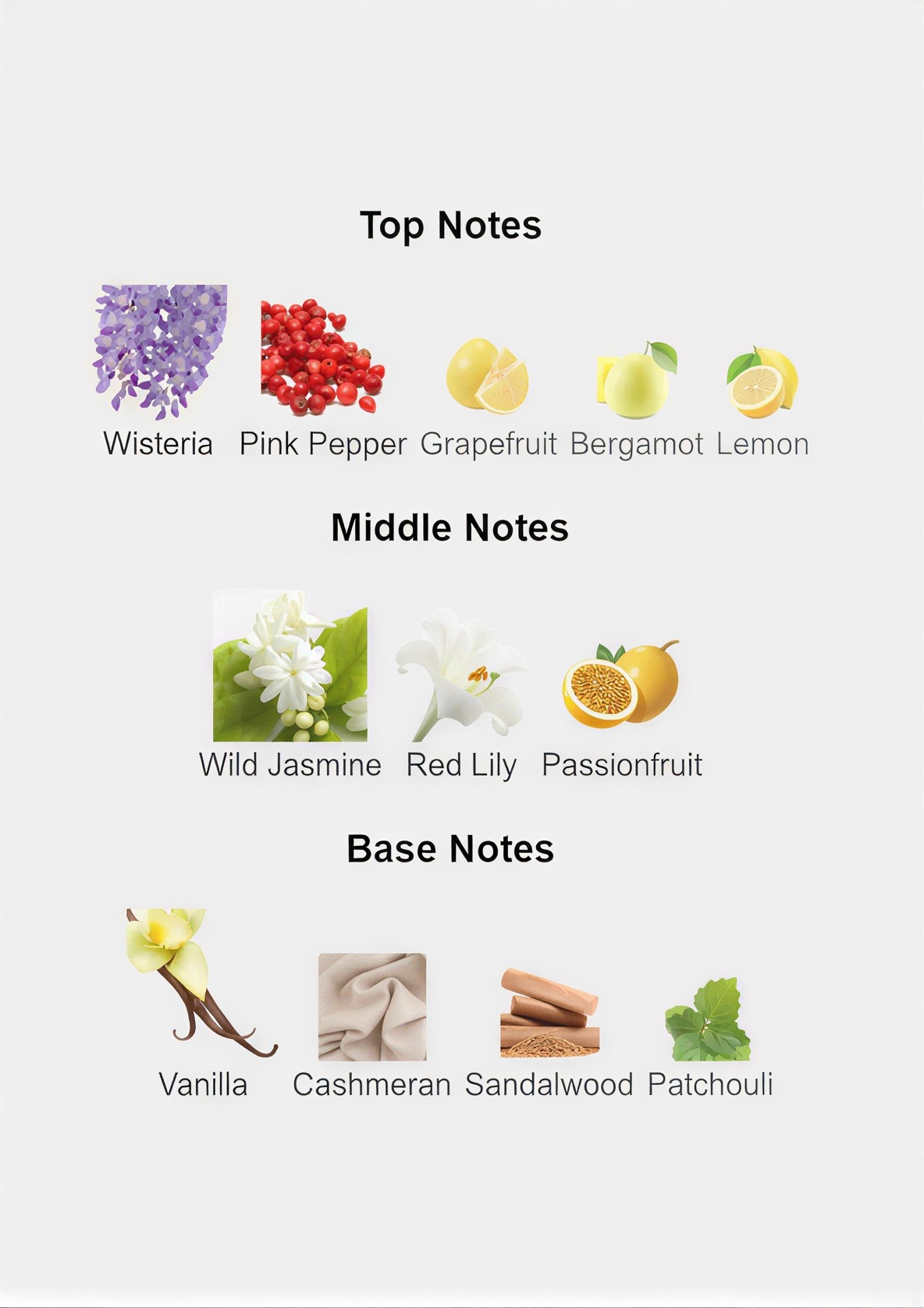 The olfactory journey begins with a captivating spark of spicy pink pepper mingled with sweet wisteria. This vibrant opening sets a bold tone, immediately commanding attention while maintaining an air of refined elegance. As the fragrance settles, it reveals a lush, intoxicating heart of wild jasmine—the signature note of the collection—fused with a surprising burst of red lily. This floral core creates a rich, creamy texture that feels like a velvet embrace against the skin.