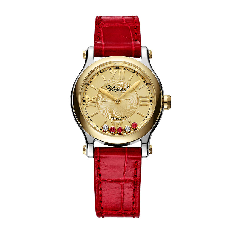 A bold emblem of Chopard’s creativity, this 30mm Happy Sport timepiece features 18k yellow gold and stainless steel. Known for its legendary “dancing gems,” the golden dial is animated by two moving diamonds and three moving rubies, paired elegantly with a classic leather strap and a self-winding mechanical movement.