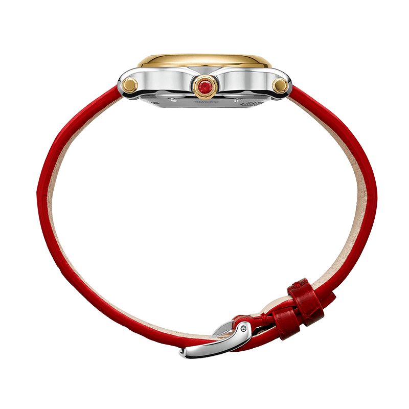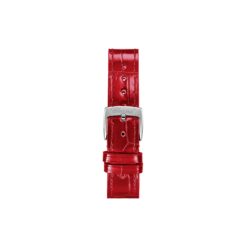At the heart of this timepiece is the enchanting golden dial, which serves as a stage for Chopard’s signature “dancing gems.” Protected between two layers of sapphire crystal, two brilliant diamonds and three vibrant rubies spin and glide freely with every movement of the wrist, creating a shimmering spectacle of light. To further elevate its regal aesthetic, a single ruby is set within the crown, adding a final touch of colored elegance.