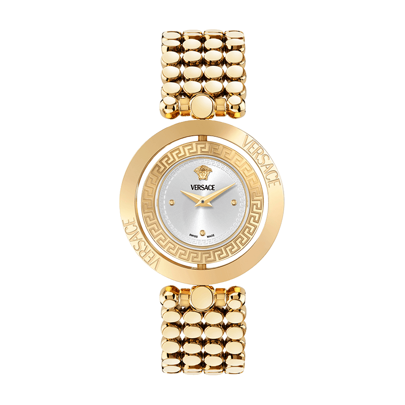 A bold expression of Italian glamour, the Versace Eon Restyling Jewels (VEHFA0625) features a unique 33.6mm dual-circle rotating case. Adorned with the iconic Greca motif and the Versace logo, this silver-tone masterpiece is finished with a 3D Medusa head and a sophisticated stainless steel bead bracelet.