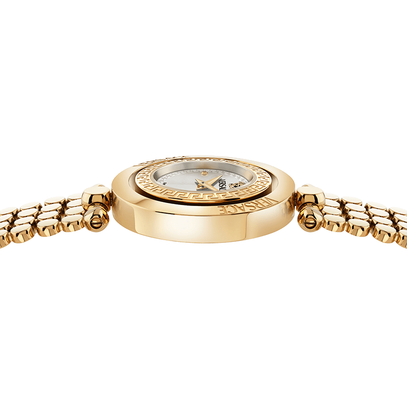The Versace Eon Restyling Jewels (Reference: VEHFA0625) is a definitive statement piece that blurs the line between high-fashion jewellery and precision horology. Designed for the woman who commands attention, this 33.6mm timepiece embodies the fearless DNA of the Versace house. The most striking feature of the Eon collection is its innovative dual-circle case construction; the outer ring is expertly engraved with the ancient Greca motif, while the inner bezel proudly displays the Versace logo, offering a multi-layered aesthetic that is unmistakably luxurious.