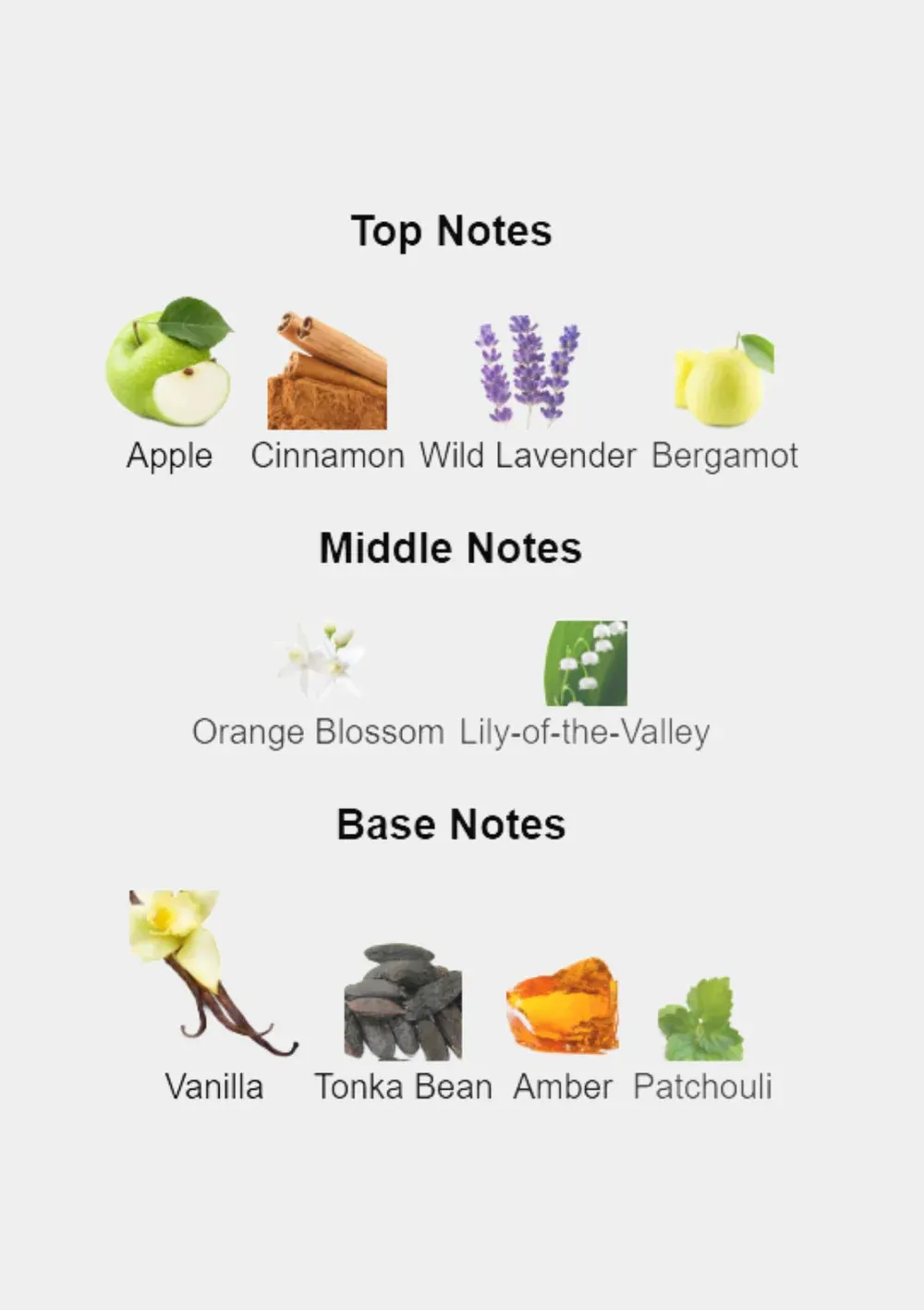 The scent journey begins with an addictive and energetic opening. Top notes of Apple and Cinnamon create a spiced-fruit accord that is both inviting and sharp, while Wild Lavender and Bergamot add a clean, aromatic edge. This initial burst provides a refreshing yet warm introduction, balancing sweetness with a traditional masculine freshness that commands immediate attention.