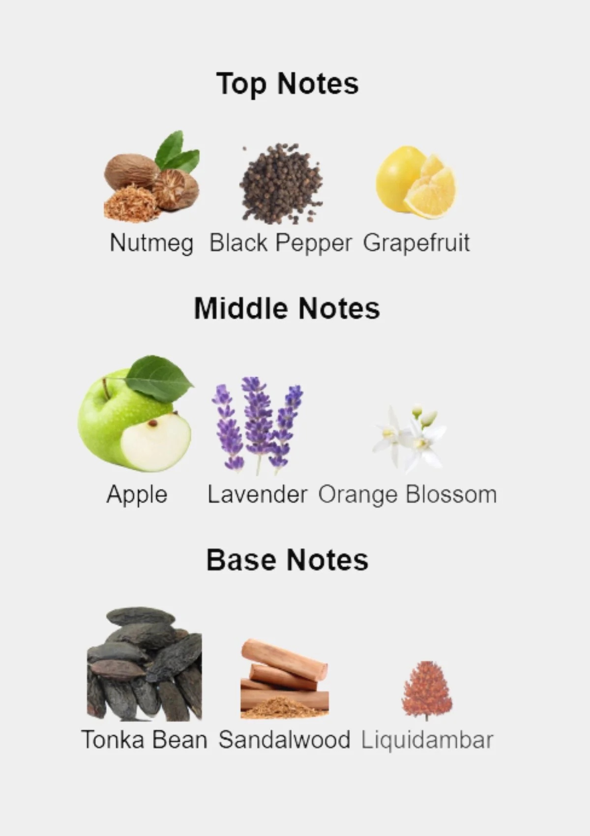 The sensory journey begins with an invigorating burst of freshness. Top notes of crisp grapefruit and spicy black pepper are tempered by the aromatic warmth of nutmeg, creating an immediate impression of refined energy. As the fragrance settles, it reveals a complex floral heart. The unexpected sweetness of apple lifts a masculine bouquet of lavender and orange blossom, providing a clean yet seductive middle layer that lingers on the skin.