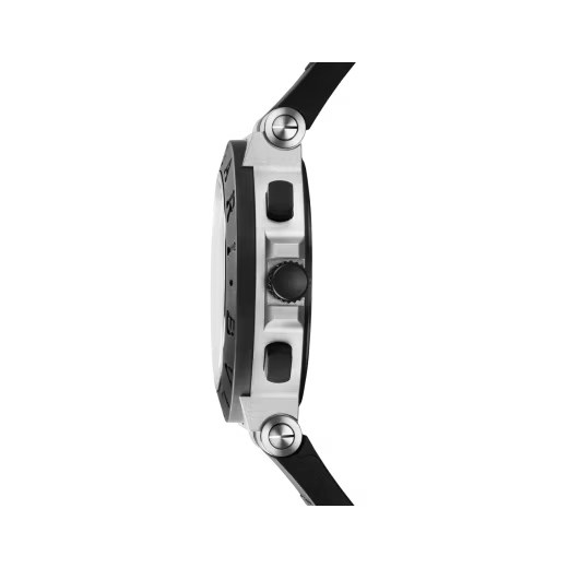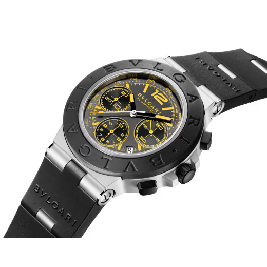At its core, the watch features a 41mm aluminium case that remains lightweight yet durable, perfectly suited for a sporty lifestyle. The aesthetic is defined by its sophisticated anthracite brushed dial, punctuated by vibrant yellow indexes and a tachymeter scale that echoes the dashboard of a performance supercar. This high-contrast color palette ensures maximum legibility and a bold, contemporary look. The signature black rubber bezel, embossed with the “BVLGARI BVLGARI” double logo, pairs seamlessly with the articulated rubber strap, providing unparalleled comfort on the wrist.