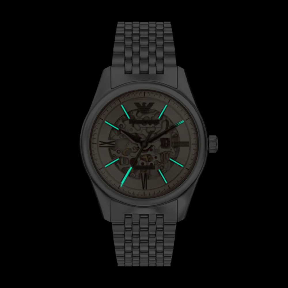 Tags: Automatic Skeleton Watch, Emporio Armani AR60095, Men's Luxury Watches, Silver Stainless Steel Watch