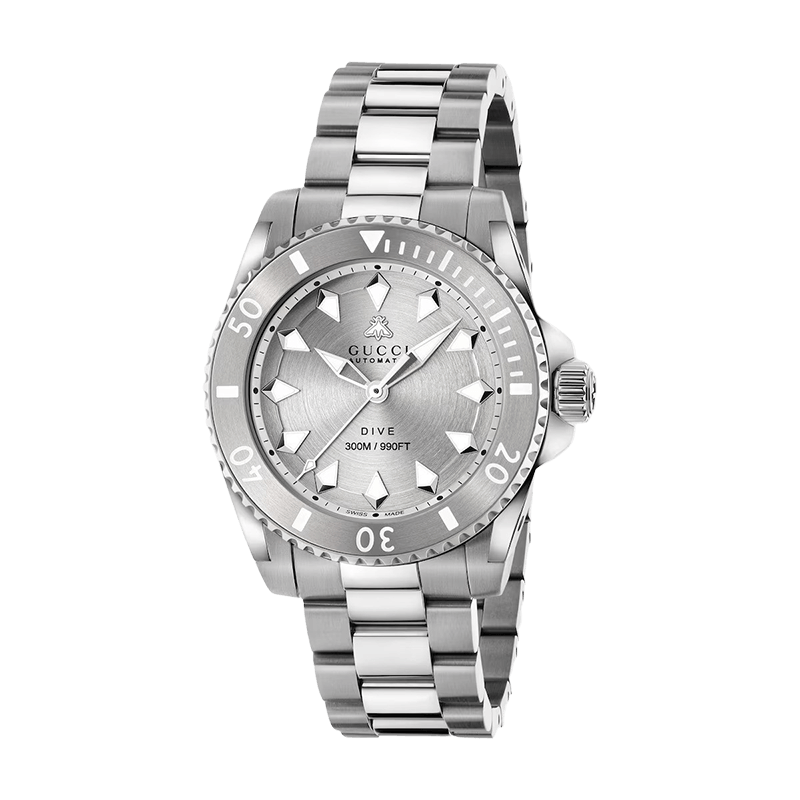 The Gucci Dive Watch (YA136354) reinterprets the classic diver’s silhouette with high-fashion flair. Featuring a 40mm silver dial centered with the House’s emblematic bee, this automatic timepiece combines a rugged steel construction with a sophisticated, contemporary aesthetic.