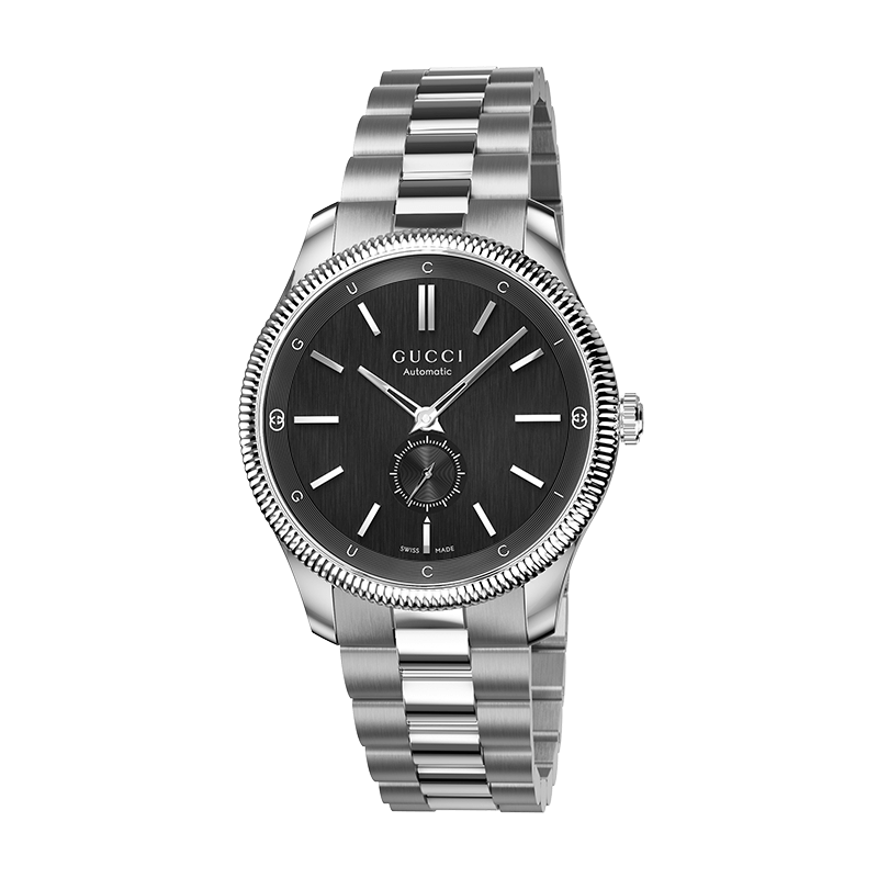 Sophisticated and minimalist, the Gucci G-Timeless Slim (YA126388) features a 40mm steel case, a sleek black dial with subtle Interlocking G motifs, and an automatic movement. Finished with a classic steel bracelet and a functional small seconds display, it is the perfect blend of modern luxury and Swiss precision.