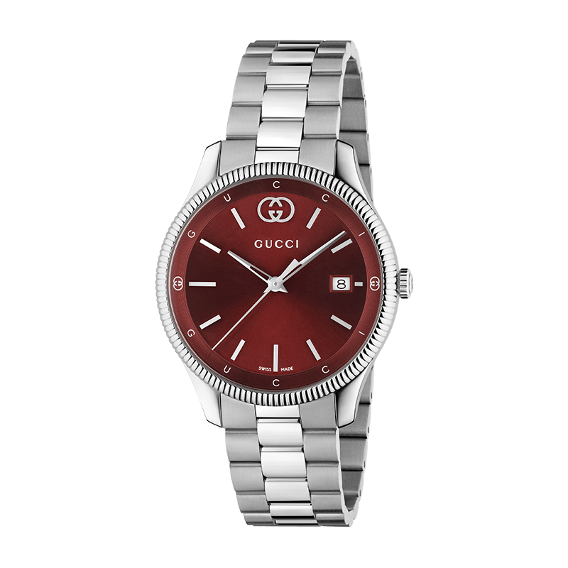 Tags: Burgundy Dial Watch, Gucci G-Timeless, Men's Luxury Watch, Steel Bracelet Watch