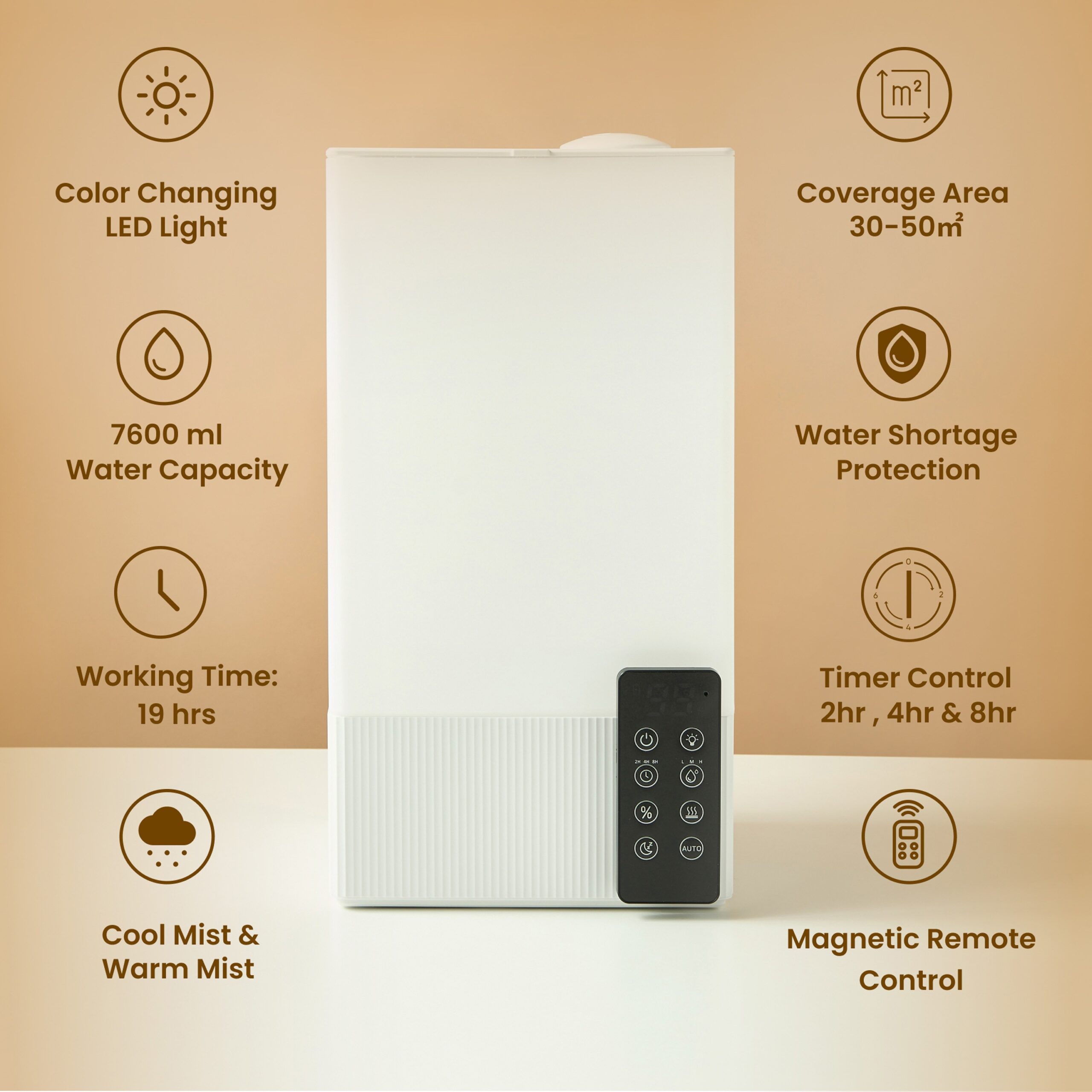 Experience uninterrupted serenity with this 7600ml high-capacity aroma humidifier. Standing 38.5 cm tall, this elegant electrical unit features a remote control for effortless air purification and fragrance diffusion, making it the perfect functional centerpiece for any modern living space.