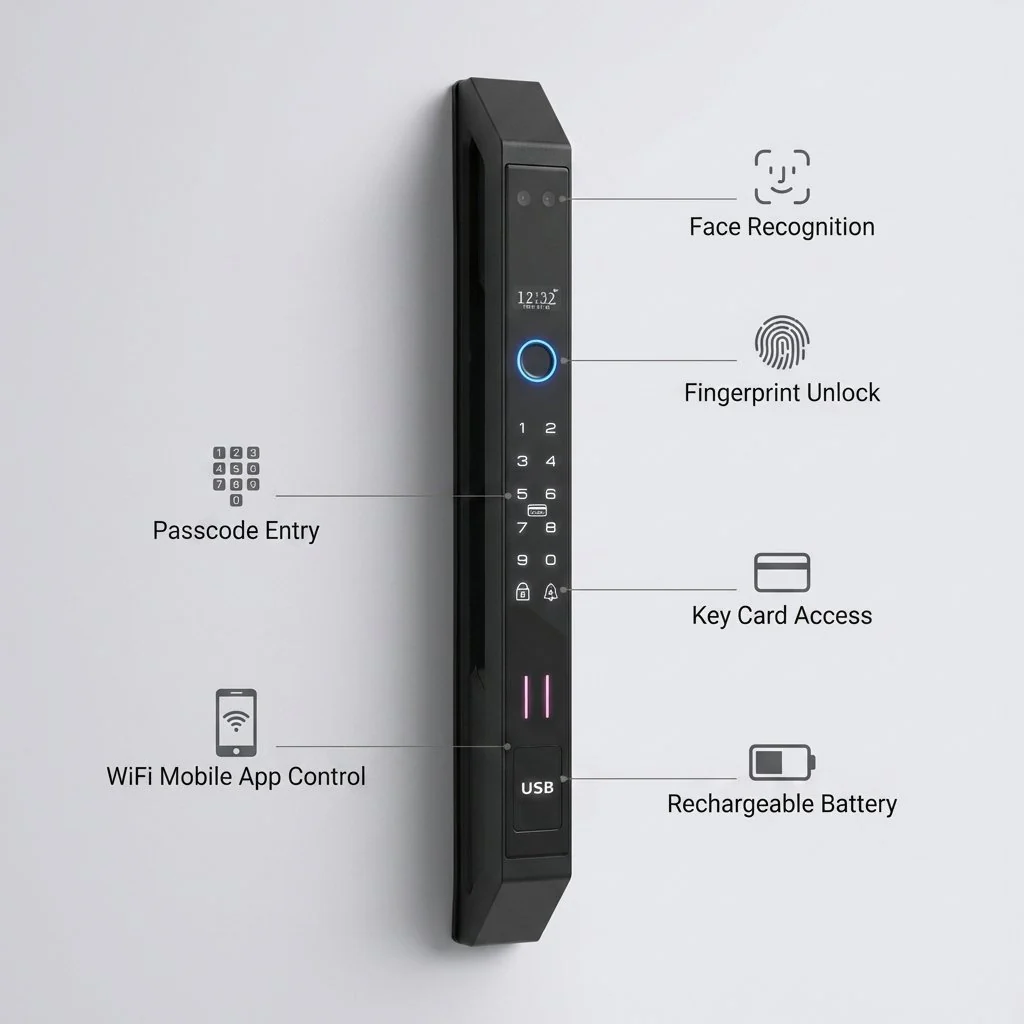 At the heart of the S99 is a suite of advanced biometric technologies. The 3D Face Recognition sensor provides a hands-free experience, identifying authorized users in seconds, while the high-precision biometric scanner can register up to 200 unique fingerprints. For guests or family members, the system also supports RFID cards, secure passcodes, and a mechanical key override for traditional backup.