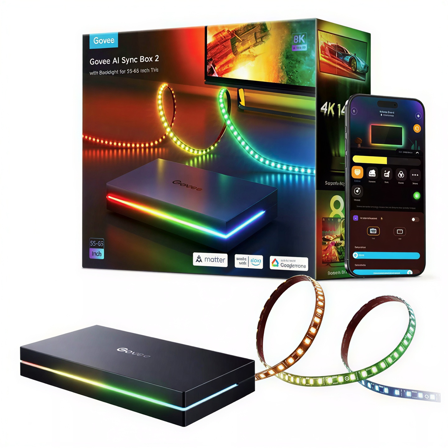 Transform your viewing experience with the Govee AI Sync Box 2. Designed for 55-65 inch TVs, this kit uses AI-driven technology to sync RGBIC backlighting with your screen content via HDMI, supporting 4K resolution and voice control through Alexa and Google Assistant.